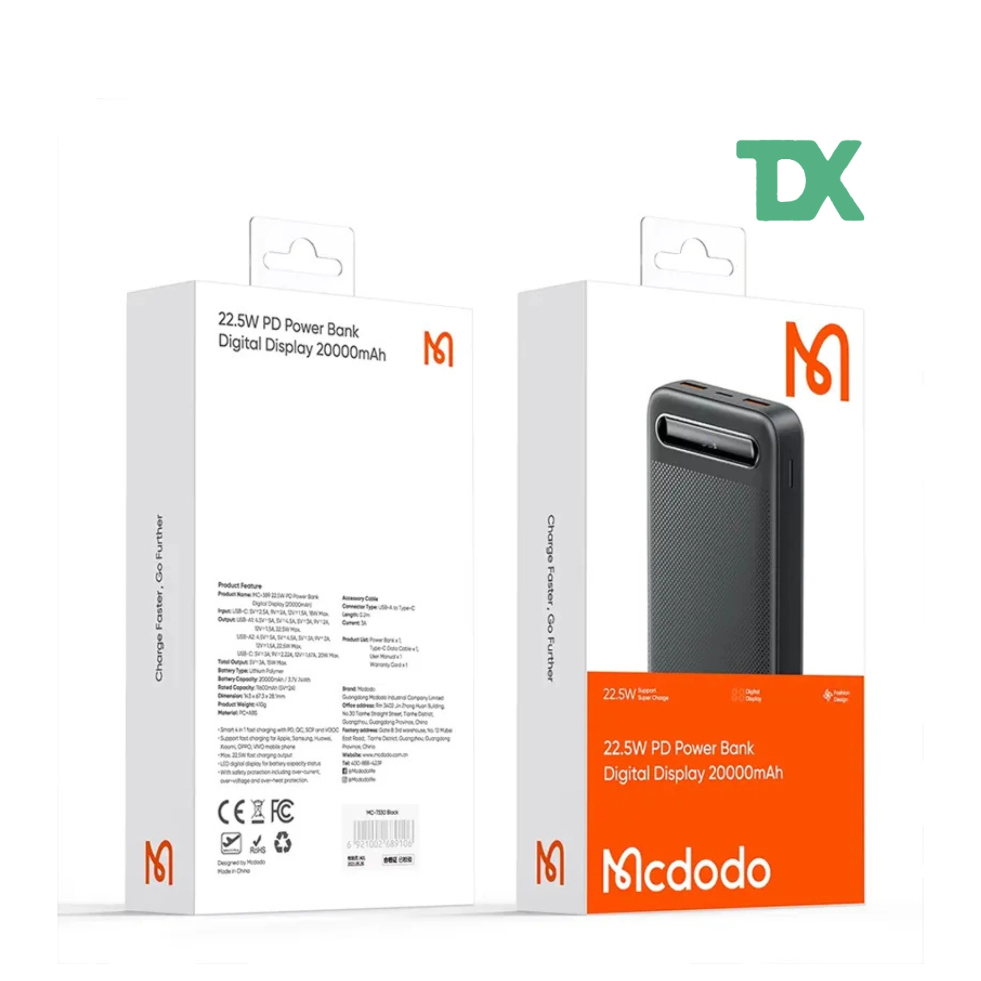 پاوربانک مک دودو مدل Mcdodo MC-389 با ظرفیت 20000 میلیآمپر، شارژ سریع PD/QC، نمایشگر LED و طراحی مقاوم؛ مناسب برای شارژ سریع گوشی و تبلت. خرید با گارانتی از تیدکس استور (tidexstore.com).