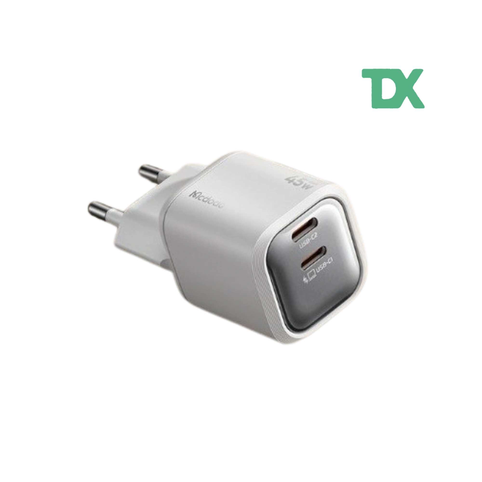 شارژر دیواری مینی 45 وات مکدودو مدل CH-100 GaN با دو پورت خروجی، طراحی جمعوجور، شارژ سریع PD و QC، و فناوری GaN انتخابی ایدهآل برای شارژ سریع و ایمن دستگاههای شماست. خرید از tidexstore.com